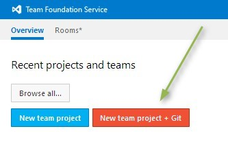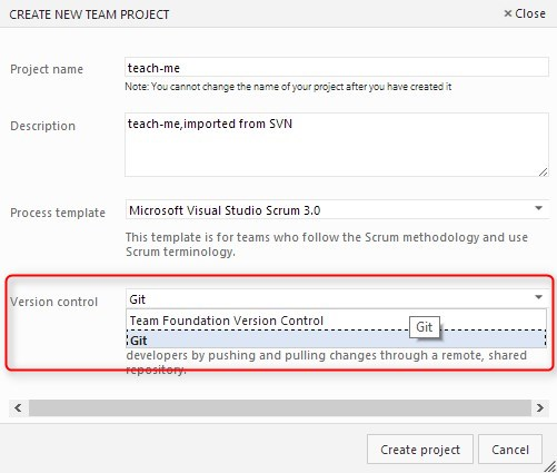 On the right side, I want to create a new TFS Team Project with Git as the centralized repository