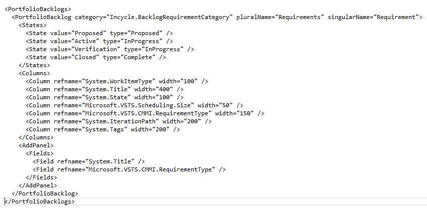 Once this is done then we will need to modify the processConfiguration.xml to enable the product backlog to use the new category we just created. Otherwise the backlog will break!