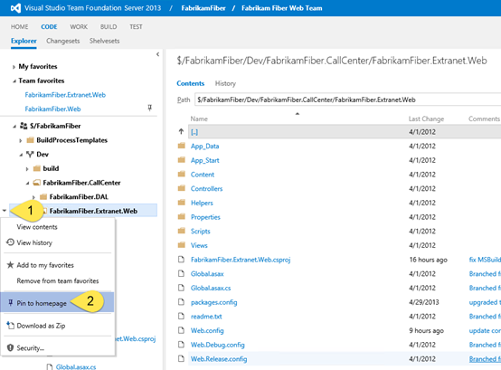 - It is not very obvious that many objects such as source control folders have context menus in Team Web Access. If you hover the mouse over a source control folder you will see an arrow that allows you to access that context menu, click on that arrow.