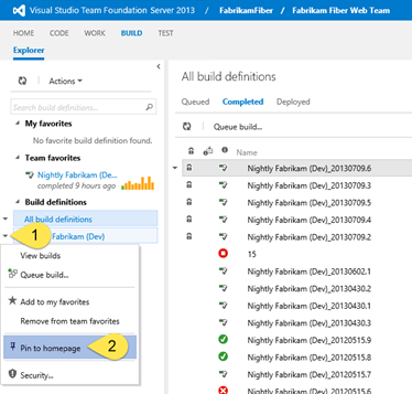 - Hover the mouse over a build definition name and click on the arrow.