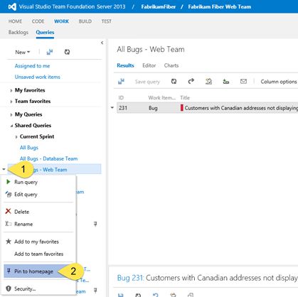 - Hover the mouse over a work item query name and click on the arrow.