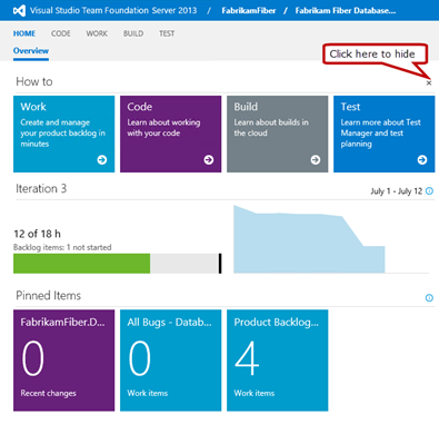 It is great that online help is just a click away when you are on the home page. However, once you are comfortable using TFS then the How to tiles just take up too much real estate on the home page. You can hide these tiles and then bring them back later if needed.